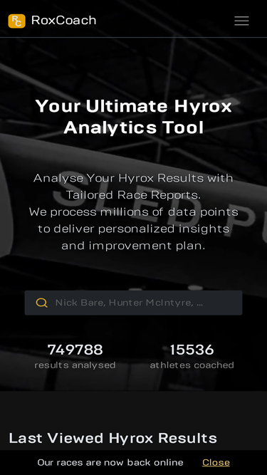 HYROX athlete profiles, athlete achievements, race analytics and race comparisons. Get ready for your next HYROX PB!