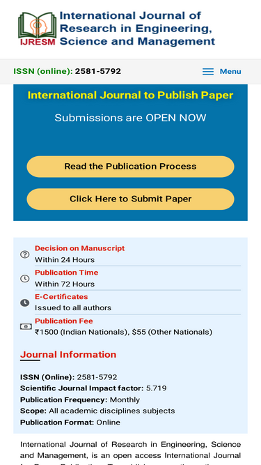 100%IJRESM is an Open Access International Journal for Paper Publication. It welcomes papers from multidisciplinary areas. Paper Publication in Journal