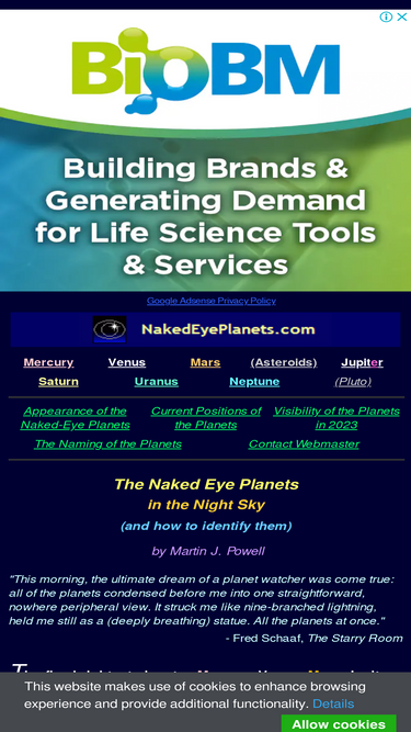 describes the appearance and movements of the planets in the dawn, dusk and night sky and what can be seen in binoculars & small telescopes. with planet position charts, photographs, origins of the planets' names, discovery histories and planetary visibility tables