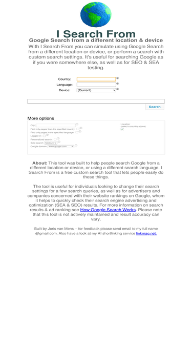 custom google search tool that lets you change the google search language, country & city location, device, and personalization settings to preview ads & organic results.