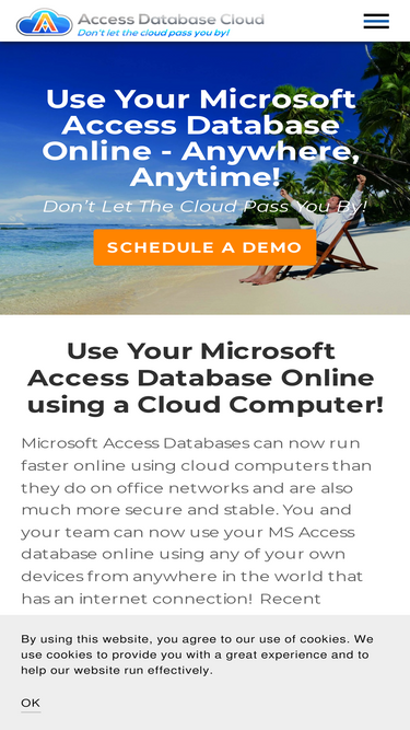 Use Microsoft Access databases on cloud desktops from anywhere, using any device. Your database can be used "as-is" on cloud desktops. Setup is simple, no pressure demos, backups included, fully managed service.