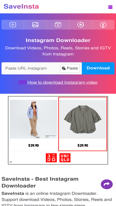 93%如何在Android上下載Instagram的照片和影片?SnapInsta下載器是一個工具,協助您快速地將Instagram上的影片、照片、Reels、Story和Profile下載到Android裝置上。支持在網頁瀏覽器上儲存和下載Instagram影片,不需要安裝軟體。