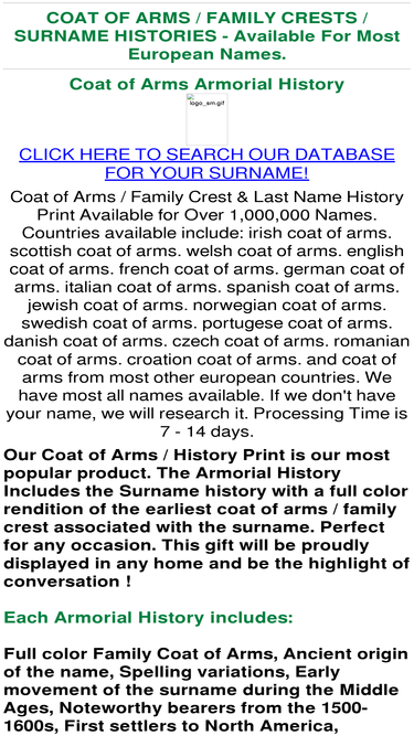 your family name researched and documented using the latest computer technology. these family heirlooms available in: parchment, embroidery, bronze shield, stained-glass.