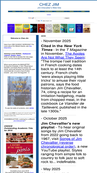 chez jim, jim chevallier's web site - a cornucopia of a panoply of a bouquet of words, images, history and the distant yet insistence aroma of breads.... among the subjects: books, creative writing, translations, bread history, free monologues, bullying, wine history, the bastille, how to cook a peacock, anthimus' de observatione ciborum, the monologue bin, suicide monologues, articles, reviews, pictures of paris, wilhoite, simon bolivar, demarquet, richcreek and chevallier genealogy, film funding information, poetry, the cannes film festival