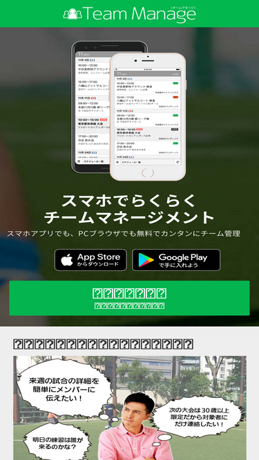 社会人サッカーチームの幹事さんの悩みから生まれた、スポーツチームのためのスケジュール&出欠管理サービスteam manage(チームマネージ)です。スポーツチーム・趣味のサークル・学生団体の運営者のためのアプリ&サービスです。