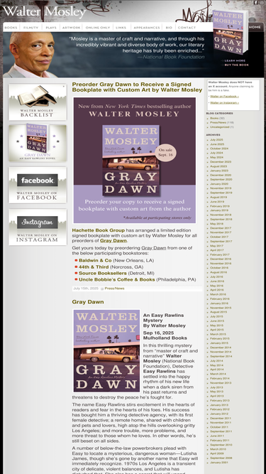the official website of walter mosley, bestselling novelist (and many other things). includes the latest book, movie and theater news; tour dates; bibliography; contact info.