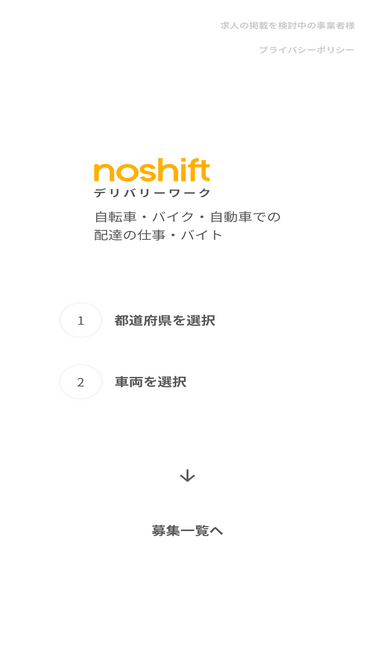 noshiftデリバリーワークでは、自転車・バイク・自動車での配達の仕事・バイトを「シフトなし」「3日以内に始められる」「支払いが1週間以内」 などの条件で探せます。