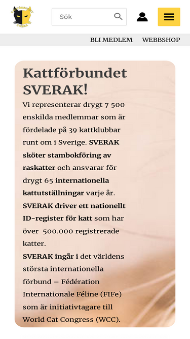 Om SVERAK SVERAKs Historia Tidning med anor Förbundsstyrelsen SVERAKs årsmöte Tidigare årsmötesprotokoll Årets Kattklubb Årets profil Utnämning av Årets kattklubb och Årets profil Anmälan av delegat/åhörare till SVERAKs årsmöte Tidigare årsmötespresentationer Dokument mm Styrande dokument Siffror & statistik Nytt i våra IT-system Sekretessinformation Kontakt Kansli Förbundsstyrelse Internrevisorer Disciplinnämnd (DN) Valberedning Tidningsredaktion FIFe och nordiska förbund Om Kattförbundet SVERAK Sveriges största kattorganisationKattförbundet SVERAK (Sveriges Kattklubbars Riksförbund), är en ideell förening och den svenska centrala organisationen av SVERAK-klubbar med enskilda klubbmedlemmar.Kattförbundet SVERAK bildades 1955Intresset för katter fanns i Sverige tidigt även om det dröjde ända fram till 1946 innan en kattklubb bildades. Svenska Kattklubben (numera Stockholms Kattklubb) drog igång sin verksamhet för svenska kattuppfödare och kattutställare med en träff som rönte stort intresse hos både allmänhet och massmedia.1950 bildades Västsvenska Kattklubben, med säte i Göteborg. Fram till 1955 verkade dessa två kattklubbar i Sverige och arrangerade utställningar och förde stambok var för sig men i samråd med varandra.Behovet av samarbete blev allt mer tydligt. I samband med en kattutställning i Stockholm träffades representanter för de båda kattklubbarna och diskuterade bildandet av en riksorganisation. Denna skulle samordna gemensamma intressen och regler samt föra gemensam stambok för hela landet.Den 19 maj 1955 såg Sveriges Raskattklubbars Riksförbund, SVERAK dagens ljus! Eftersom inriktningen under åren ändrades så att även huskatter tilläts ställas ut ändrades ordet ”Raskattklubbar” till ”Kattklubbar” vid 1981 års årsmöte. Den vedertagna förkortningen SVERAK kvarstod dock.SVERAK-klubbarna ÄR SVERAKSedan att antal decennier tillbaka är Kattförbundet SVERAK den centrala organis