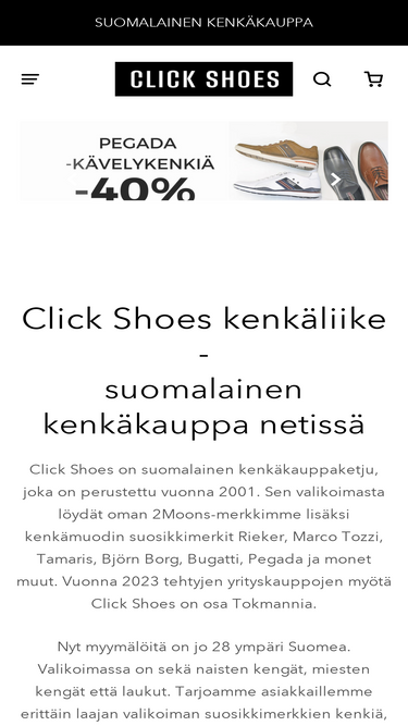 98%Click Shoes-kenkäliike löytyy nyt myös netistä. Monipuolinen ja kattava valikoima sekä nopeat toimitukset. Suomalainen kenkäkauppa verkossa.
