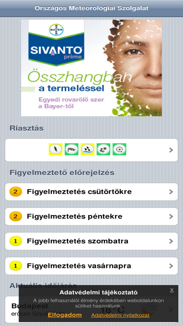 60%Időjárás, Megfigyelések, Előrejelzés, Éghajlat, Balatoni széladatok, Balatoni viharjelzés, Vízhőmérsékletek, METAR, TAF, UV-B sugárzás, Műhold, Radar, Égkép, Napkelte, Napnyugta, Holdkelte, Holdnyugta, Meteorológia, Orvosmeteorológia, Levegőkörnyezet, Levegőkörnyezeti tájékoztató