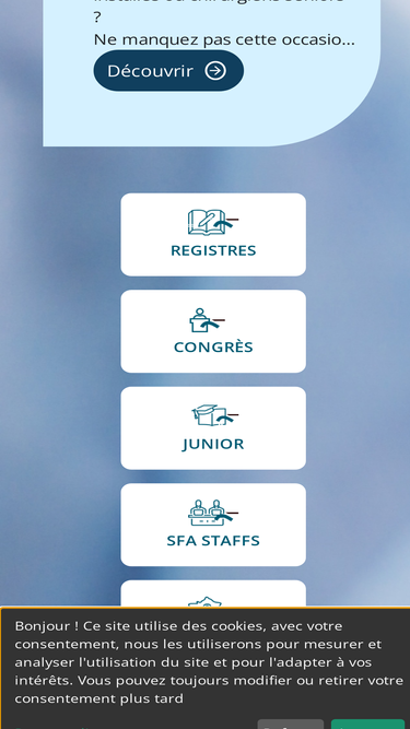 Le Bureau de la SFA Qui est à la tête de la SFA ? Qui anime l'association ? VOIR PLUS Le bureau exécutif Qui administre la SFA ? VOIR PLUS Annuaire des membres Retrouvez les membres de la SFA VOIR PLUS , Le Bureau de la SFA Qui est à la tête de la SFA ? Qui anime l'association ? VOIR PLUS , Le bureau exécutif Qui administre la SFA ? VOIR PLUS , Annuaire des membres Retrouvez les membres de la SFA VOIR PLUS , Historique Grâce à la SFA, l'arthroscopie s'est largement répandue à travers la France et a pénétré maintenant le cursus des études médicales. La Société elle-même, et un grand nombre de ses membres actifs, participent à des études coopératives et à des recherches au sein de notre Société... VOIR PLUS Statuts de la SFA Articles déterminants l'organisation de la SFA VOIR PLUS Adhésions Pourquoi adhérer à la SFA ? Et Comment ? VOIR PLUS , Historique Grâce à la SFA, l'arthroscopie s'est largement répandue à travers la France et a pénétré maintenant le cursus des études médicales. La Société elle-même, et un grand nombre de ses membres actifs, participent à des études coopératives et à des recherches au sein de notre Société... VOIR PLUS , Statuts de la SFA Articles déterminants l'organisation de la SFA VOIR PLUS , Adhésions Pourquoi adhérer à la SFA ? Et Comment ? VOIR PLUS , PUBLICATIONS Les publications de la SFA VOIR PLUS SFA Régions La SFA a mis en place un projet ambitieux de développement régional avec la création de "SFA Régions". Ce projet a pour objectif de renforcer la présence et l'action de la SFA sur l'ensemble du territoire français, en permettant à chaque région de bénéficier de formations, de cours, de webinaires, de mini-congrès, de séminaires, et de podcasts, tous soutenus et encadrés par le bureau central de la SFA. VOIR PLUS , PUBLICATIONS Les publications de la SFA VOIR PLUS , SFA Régions La SFA a mis en place un projet ambitieux de développement régional avec la création de "SFA Régions". Ce projet a pour object