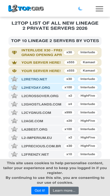 Lineage 2 Private Server list ( l2top ) with all l2 servers. top game sites. Low Rate Lineage 2 Server List, Mid Rate la2, PvP l2 Server, l2oops, l2hopzone, l2topzone, L2 Classic servers, L2 H5 servers, L2 Interlude servers, L2 Prelude, L2 Fafurion, L2 Remastered