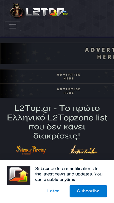 65%https://l2top.gr Οι καλύτεροι L2 server που υπάρχουν στον κόσμο του Lineage2! Μπείτε τώρα στο site μας και βρείτε όλα τα chronicles c6,H5. Το πρώτο Ελληνικό L2topzone list.