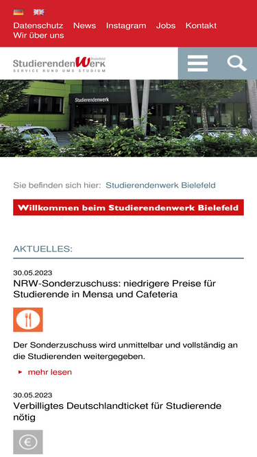 Beachten Sie bitte die verkürzten Öffnungszeiten am 19.12. in den gastronomischen Einrichtungen. Eine Übersicht über die Schließzeiten aller Bereiche des Studierendenwerks finden Sie hier.