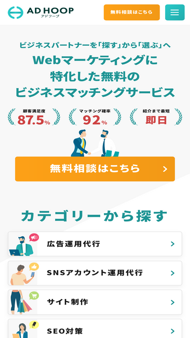 失敗しないパートナー選びならアドフープ。完全無料でご利用可能。候補パートナーの担当者情報やレビュー評価が見れ、コンシェルジュが選定基準や要望の整理を徹底サポート。最短即日でご紹介。