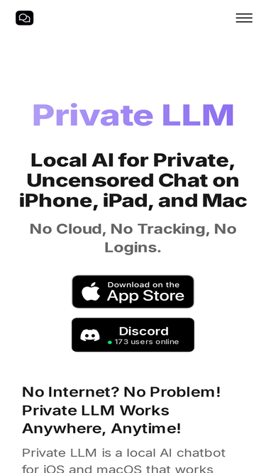 86%Discover Local AI like never before. With Private LLM, enjoy uncensored chat, creativity, and productivity with privacy on your iPhone, iPad, and Mac. Your AI, your rules.