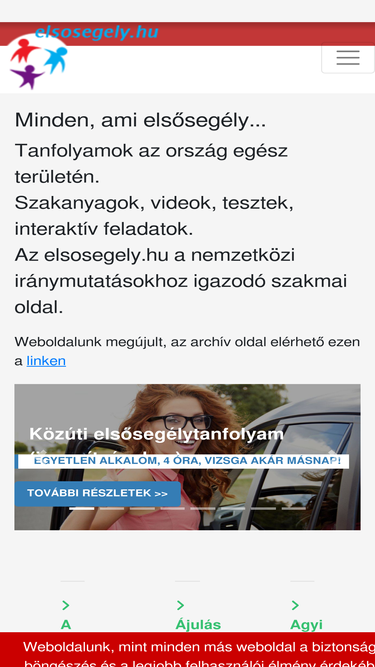 Az oldal üzemeltetője az Elsősegélynyújtás Oktatásáért Alapítvány, melynek célja a magasszínvonalú, hiteles elsősegély-oktatás és információközlés előmozdítása. Tanfolyamok, szakanyagok, videok, tesztek, interaktív feladatok. Az elsosegely.hu a nemzetközi iránymutatásokhoz igazodó szakmai oldal.