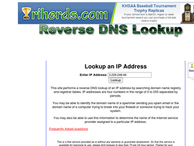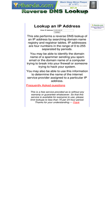look up an ip address to find the domain name and country for the ip address. then get the "whois" database information for the domain.