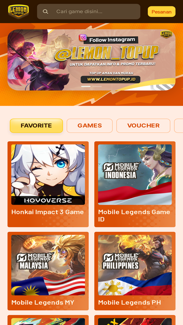 Fasilitas terbaru untuk para gamers yang menyediakan pelayanan topup berbagai macam game favorite kalian seperti Mobile Legends, Valorant, PUBG Mobile, Free Fire, dan masih banyak game lainnya dengan mudah dan terpercaya
