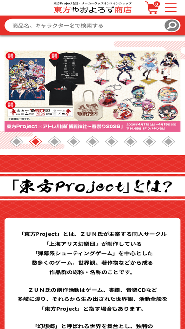 「東方やおよろず商店」とは「上海アリス幻樂団」の公認を受けて開設された、「東方project」のメーカー(企業)グッズを販売する専用通信販売サイト(オンラインショップ)です。