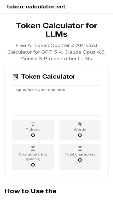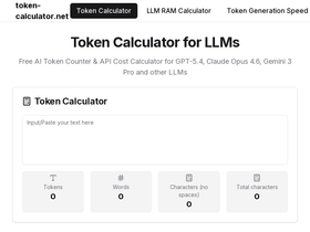 76%Calculate tokens and API costs instantly for GPT-5.3, Claude Opus 4.6, and Gemini 3 Pro. Accurate BPE tokenizer for inputs, cached inputs, and outputs.