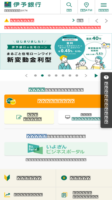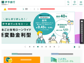 伊予銀行のホームページです。住宅ローン、外貨預金、投資信託等の各種商品・サービスのご紹介等を掲載しています。また、インターネットバンキングでは、残高照会や振込の他、定期預金のお預け入れにもご利用いただけます。