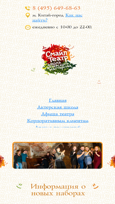 64%театральная школа «smile» предлагает записаться на курсы в студию актерского мастерства детям и взрослым. учеников ждет увлекательная программа занятий и интересные тренинги. запись по телефону 8 (495) 649-68-63.