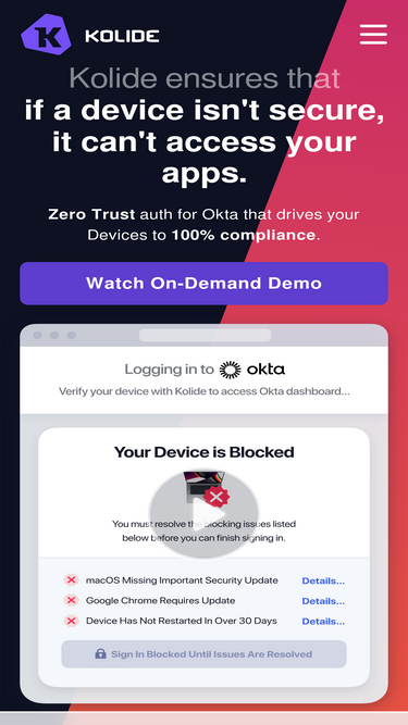Kolide is a part of 1Password Device Trust, which helps you reach your compliance goals through the power of end-user self-remediation. We leverage the principles of Zero Trust to block a device from accessing your SaaS apps and other resources if it isn’t running the Kolide agent or passing specific requirements.