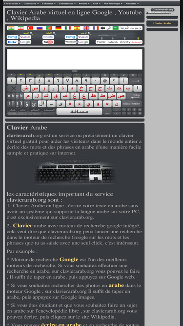 65%clavier arabe en ligne avec moteur de recherche google intègrée permet d’écrire des lettres et des alphabets en arabe plus précisément avec des nouveaux et nombreux services en ligne et gratuitement.