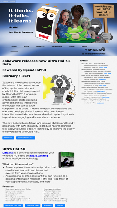 zabaware is the creator of award winning artificial intelligence (ai) technology called ultra hal. ultra hal is an entertaining chatbot that learns and evolves from conversation. the more you talk to it the smarter it becomes.