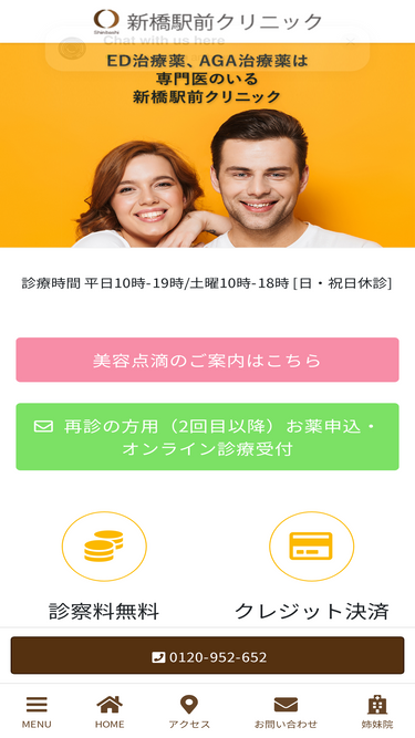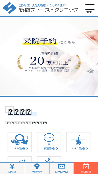 ED治療、早漏治療、AGA治療、にんにく注射などを扱う東京都港区新橋にある男性専門のクリニック、新橋ファーストクリニックです。スタッフは全員男性。平日は夜8時(20時)まで受付。土日祝も診療。予約不要。新橋駅から最短徒歩約3分。診察料・初診料・再診料・処方料0円。オンライン診療もOK。