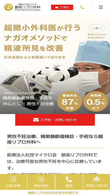 精索静脈瘤などの男性不妊手術専門クリニック「銀座リプロ外科」です。当院では日帰り顕微鏡下手術にて、精索静脈瘤をはじめとする様々な症状の外科手術を行っております。不妊治療のみならず、難治性EDや生殖医療も実施しておりますので、お悩みの方はご来院ください。
