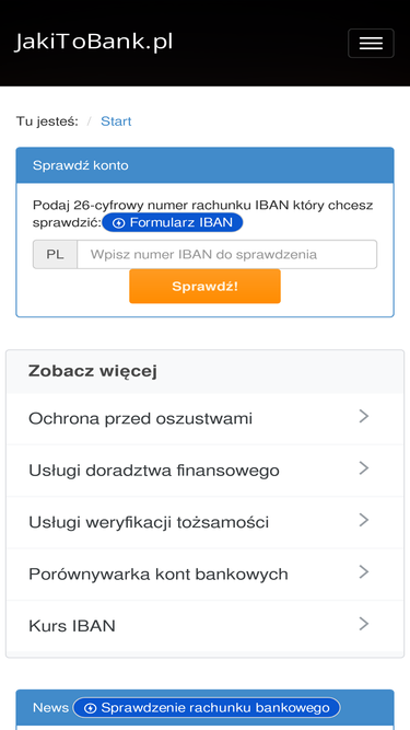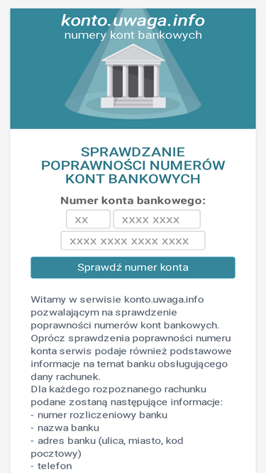 sprawdzenie poprawności numerów kont bankowych oraz informacje na temat banku obsługującego dany rachunek (nazwa, adres, telefon, strona, kod bic/swift).