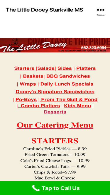 100%Starters |Salads| Sides | Platters | Baskets| BBQ Sandwiches | Wraps | Daily Lunch Specials Dooey’s Signature Sandwiches | Po-Boys | From The Gulf & Pond | Combo Platters | Kids Menu | Desserts Our Catering Menu STARTERS Caroline’s Fried Pickles — 8.99 Fried Green Tomatoes– 10.99 Cole’s Fried Cheese Logs — 10.99 Carter’s Crawfish Tails […]