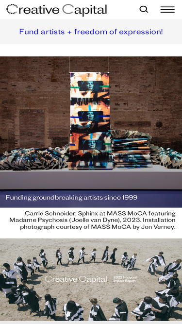 Creative Capital is a nonprofit, grantmaking organization with the mission to fund artists in the creation of groundbreaking new work, to amplify the impact of their work, and to foster sustainable artistic careers.