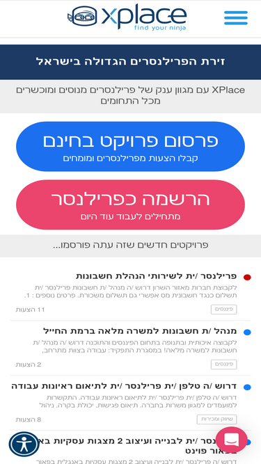 100%פרילנסרים לעבודות פרילנס, עבודה מהבית, זירת פרילנסרים הגדולה בישראל. XPlace זה הבית של פרילנסר המציג עבודות פרילאנס המתאימות למומחים פרילנסרים מכל תחום.