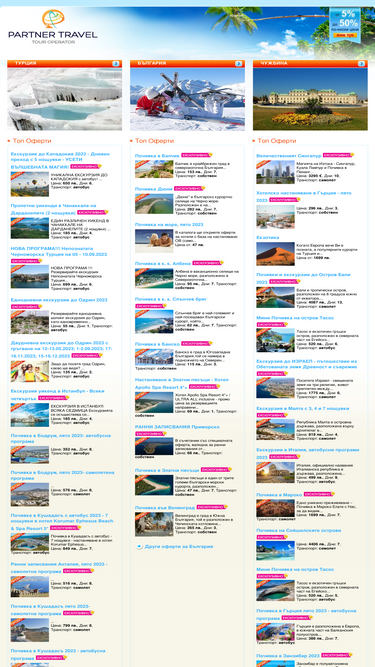 партнер травел - зимни и летни почивки и екскурзии. хотели, оферти за почивки в турция - кушадасъ, бодрум, мармарис, айвълък. аll inclusive почивки. екскурзии в истанбул. хотели, уикенди, оферти и почивки в българия. спа почивки. екскурзии и почивки в европа и други дестинации.