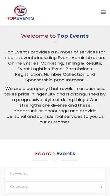 Top Events provides a number of services for sports events. Event Administration Online Entries Marketing Timing and Results Event Logistics.