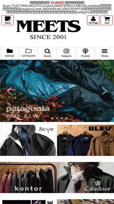 meetsは "orslow/オアスロウ"、"scye/サイ"、"teatora/テアトラ"、"master & co./マスターアンドコー"、"guepard/ギュパール" などクオリティーの高い国内ブランドから "patagonia/パタゴニア"、"individualized shirts/インディビジュアライズドシャツ"、"russell moccasin/ラッセルモカシン"、"l.l.bean/エルエルビーン" などのアメリカ物、"jamieson's/ジャミーソンズ"、"tender co./テンダー"、"barbour/バブアー"、"sanders/サンダース"、"yarmo/ヤーモ"、"tilak/ティラック" などのヨーロッパからのインポート物などをmeetsのフィルターを通して通販している熊本のセレクトショップです。patagonia正規販売店。