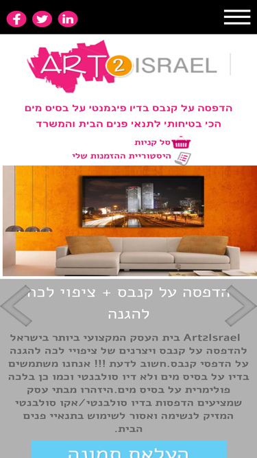 ניתן לפתח אצלנו תמונות על בד קנבס בהדפסה דיגיטלית. העבודה כוללת פיתוח תמונה בדיו פיגמנטי על בסיס מים ולא דיו סולבנטי רעיל + ציפוי לכה להגנה + מתיחה על מסגרת עץ.