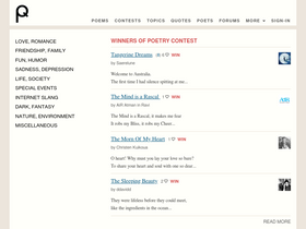 根据 Similarweb 的月访问量数据,poetryinvoice.ca 在 十二月 2025 的头号竞争对手是 poems-and-quotes.com。与 poetryinvoice.ca 相似度排名第二的网站是 poetrysociety.org,排名第三的是 allpoetry.com。