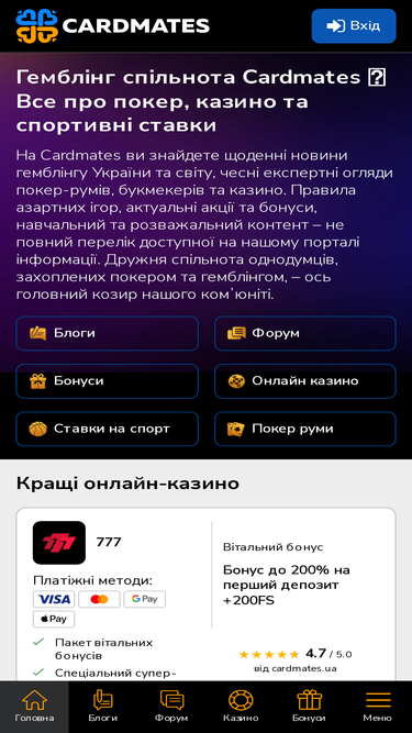 приєднуйтесь до нашої спільноти на cardmates! експертні огляди гемблінг майданчиків, навчальні матеріали, актуальні бонуси, останні новини індустрії.
