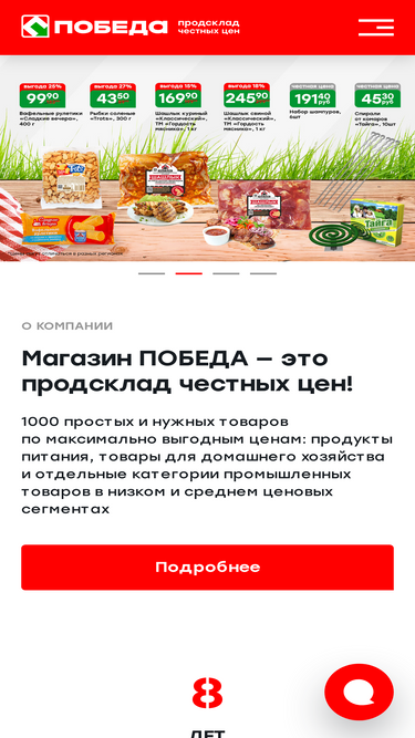 ПОБЕДА — это магазины честных цен! Товары на каждый день по честным ценам: продукты питания, товары для домашнего хозяйства и отдельные категории промышленных товаров в низком и среднем ценовых сегментах.