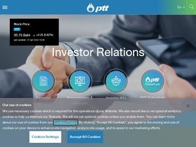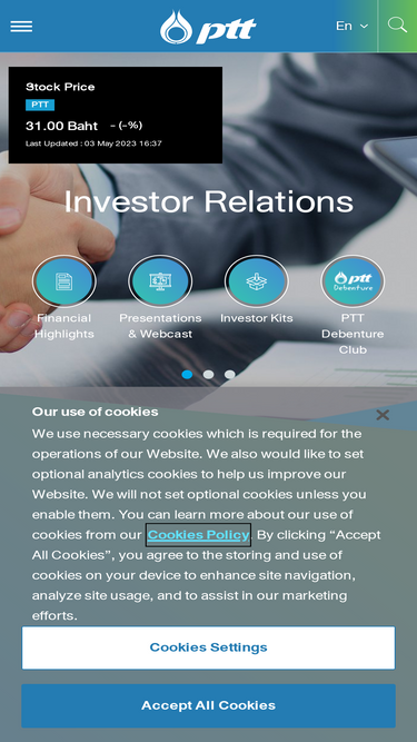 ราคาน้ำมันวันนี้ ค้นหาสถานีบริการน้ำมัน * เป็นราคา ณ กรุงเทพฯ ที่ยังไม่รวมภาษีบำรุงท้องที่ (ถ้ามี) ค้นหาสถานีบริการน้ำมัน ราคาน้ำมันย้อนหลัง ธุรกิจของเรา ธุรกิจน้ำมัน ธุรกิจค้าปลีก ธุรกิจต่างประเทศ ราคาหุ้นวันนี้ บาท / หุ้น OR เป็นผู้นำในการคิดค้นนวัตกรรมน้ำมันเชื้อเพลิงของประเทศ รวมถึงก๊าซปิโตรเลียมเหลวที่มีคุณภาพสูงตอบสนองความต้องการของลูกค้า ที่มีความแตกต่างกันได้อย่างลงตัว เพิ่มเติม ราคาหุ้นวันนี้ บาท / หุ้น OR ทำให้สถานีบริการน้ำมัน พีทีที สเตชั่น เป็นมากกว่า “สถานีบริการน้ำมัน” เพื่อเติมเต็มทุกความต้องการและส่งมอบประสบการณ์ที่ดีให้แก่ผู้บริโภค ทั้งในและนอกสถานีบริการน้ำมันฯ เพิ่มเติม ราคาหุ้นวันนี้ บาท / หุ้น OR ต่อยอดความสำเร็จของรูปแบบทางธุรกิจจากในประเทศสู่เวทีนานาชาติ สร้างชื่อเสียงให้แบรนด์ไทยเป็นที่รู้จักในระดับสากล ด้วยการผสมผสานธุรกิจน้ำมัน ธุรกิจค้าปลีก และธุรกิจอื่นๆ ที่ประสบความสำเร็จเป็นอย่างดีในประเทศ เพิ่มเติม ข่าวสาร OR ข่าวสาร โปรโมชั่น ดูทั้งหมด พีทีที สเตชั่น...