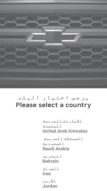 please choose your preferred country from chevrolet arabia official website to view the latest sedans, hatchbacks, suvs, trucks and vans. يرجى اختيار البلد المفضل لديك من موقع شيفروليه الرسمي لمشاهدة أحدث سيارات السيدان ، هاتشباك ، وسيارات الدفع الرباعي ، والشاحنات والشاحنات الصغيرة.