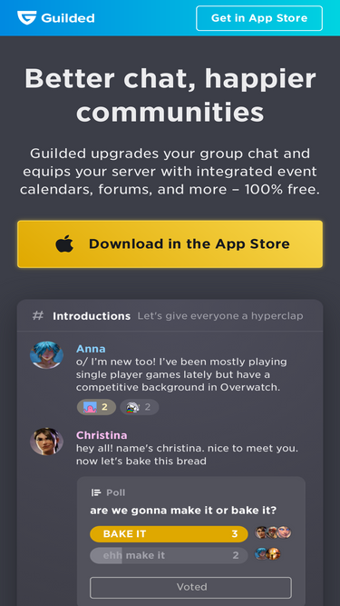 Guilded upgrades your group chat and equips your server with integrated event calendars, forums, and more – 100% free.