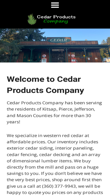 91%Contact Cedar Products Company for your cedar siding, fencing, decking, and dimension lumber needs. We supply cedar products to customers from Kitsap, Pierce, Mason, King, Clallam and Jefferson Counties.