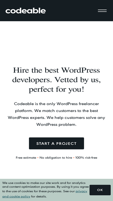 65%Codeable is the only WordPress freelancer platform. We match customers to the best WordPress experts. We help customers solve any WordPress problem.