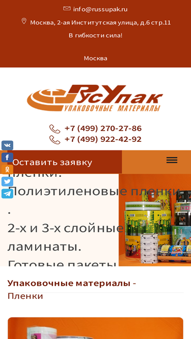 98%наша компания «русупак» занимается производством и продажей гибкой полимерной упаковки в москве и московской области под товарной маркой русупак уже более 15 лет, и за это время сумела добиться многих достижений, главное из которых – признание и уважение постоянных клиентов. наличие собственного транспортного парка и сотрудничество с ведущими транспортными компаниями сделало возможным быструю доставку в разные регионы россии. наш телефон в москве +7 (499) 270-27-86 и +7 (499) 922-42-92