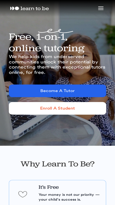 Free online tutoring! Learn To Be provides 1-on-1 online tutoring to under-resourced students at no cost. Sign up a student, or join our volunteer tutors.